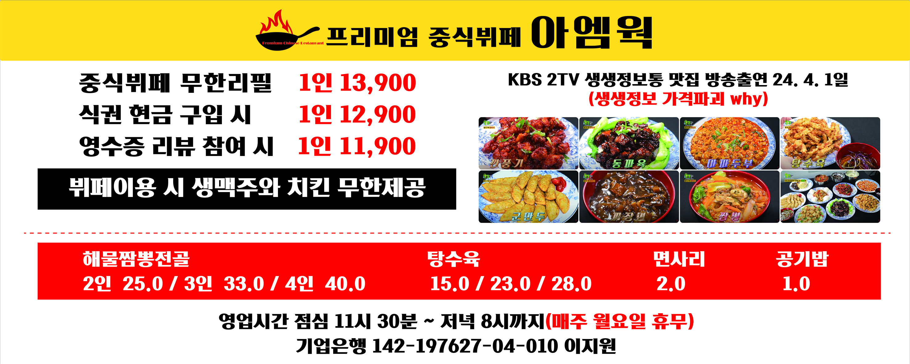 | 소개글: 중식 무한리필 집 -아엠웍- 입니다 저희는 무려 10가지이상 중식요리를 맛볼 수 있는 중식 무한리필 가게입니다! 프라이빗하게 드실 분들을 위하여 룸 완비돼있습니다!, 예약제 오마카세도 하고 있으니 많은 관심 부탁드립니다! 점심:중식 무한리필(11:30~14:30) 끓여먹는 해물짬뽕전골도 있으니 한 번 봐주시면 감사하겠습니다 ! |