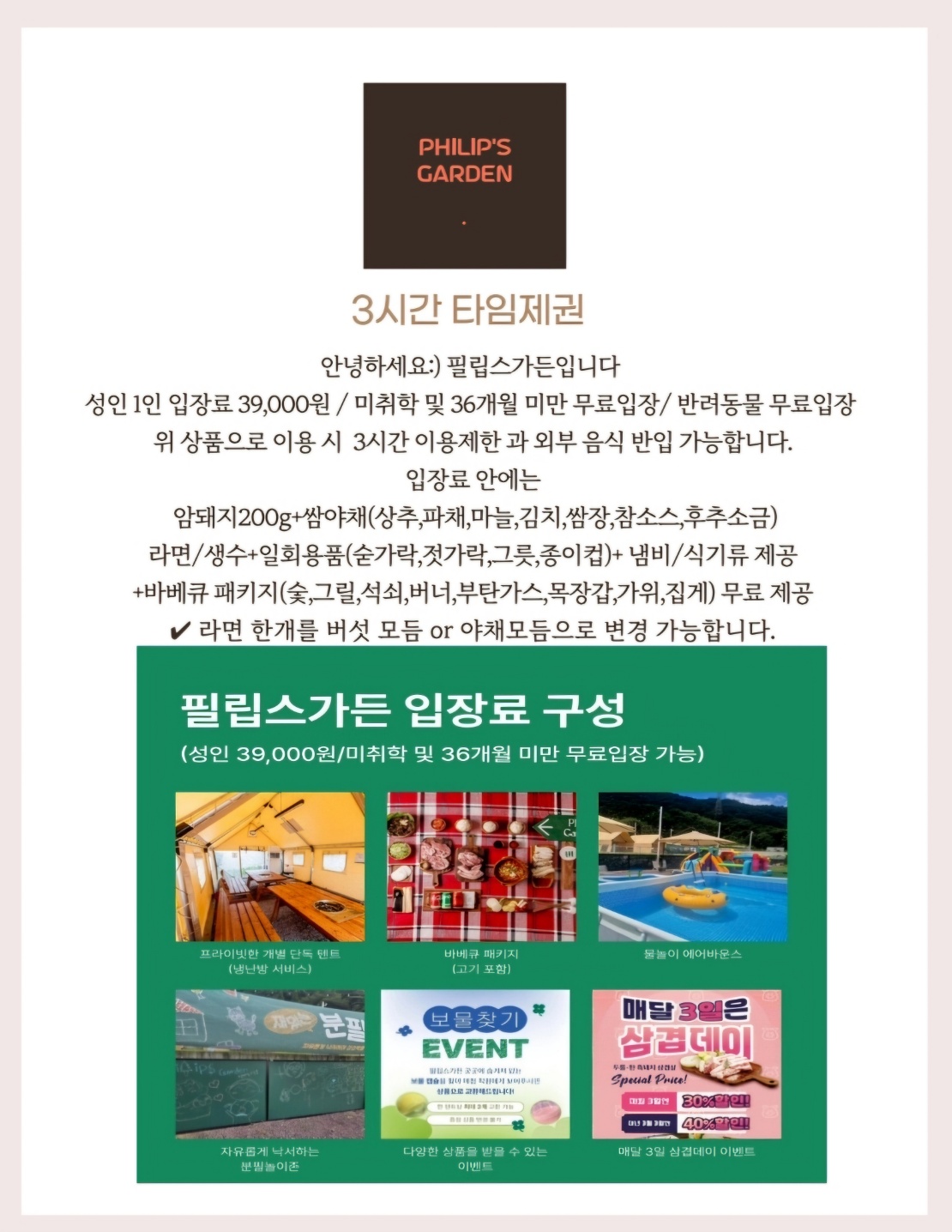 | 소개글: -캠핑은 가고 싶은데 장비 챙기기는 힘드셨죠? -아이가 마음껏 뛰어놀게 하고 식사도 하고 싶으셨죠? -반려견과 함께 식사하실 곳이 없으셨죠? -분위기 있는 곳에서 나의 연인과 친구와 가족과 진솔한 대화를 하고 싶으셨다구요? 필립스가든은 멀지 않은 산 속에 내 가족과 내 반려견을 위해 만든 작은 힐링 BBQ 캠핑장입니다. [서비스 & 시설안내] -단독텐트(냉난방시설 완비) -BBQ 그릴세트(숯, 그릴, 김치, 물, 집게류 등) 제공 -테이블 버너세트(로스터, 불판 등) 제공 -무료 주차장 -보물 찾기 [아이들 놀거리] 모래놀이 / 물놀이 / 에어바운스 / 칠판낙서놀이 /바닥 낙서놀이 / [반려견 놀거리] 애견운동장 [ 예약 방법] - 네이버/캐치테이블 이용 - 매장 전화번호 010-9740-3905 [ 주소] 김해시 생림면 나전리30-22 [ 영업시간 ] 평일 12:00 ~ 22:00 * 기본 2~6인 텐트 l 이용시간제한없음 l * 기본 7인~12인 텐트 l 이용시간 3시간 l 주말 및 공휴일 l 3시간 이용 l 1부 11:00 ~ 14:00 2부 14:30 ~ 17:30 3부 18:00 ~ 21:00 * 주말 2회차 연속 예약 원하시는 경우 반드시 매장으로 연락주세요. -임의로 연락 없이 연속 회차 예약하시는 경우 자동 취소되니, 반드시 매장으로 연락바랍니다. -간혹,다른 성함으로 연속회차 예약하시는 분들이 계십니다. 적발시 예약금환불은 어려우며,단체텐트비용과 동일한 예약금 결제가 되니 꼭 매장으로 문의 전화 먼저 주세요! -단,매장 예약상황에 따라 연속회차가 불가능 할 수도 있으니 참고바랍니다. -연속회차시 기본텐트50,000원/힐링텐트 70,000원/ 단체텐트10,0000원 ※반드시 매장으로 문의 먼저 해주세요 [ 셀프운영제 ] - 매점에서 예약자확인 후 텐트배정 - 매점에서 구매 - 퇴점시 텐트 셀프 정리 및 셀프 분리수거 - 야유회 및 워크샵 단체문의 대관문의는 매장으로 연락주세요. [ 주의사항 ] - 이용 시간은 지정 예약 시간으로부터 이며, 퇴실 후 다음 손님을 위한 정리 시간이 필요하오니 퇴실 시간 및 입실시간 꼭 준수 바랍니다 - 필립스가든 전체구역 흡연 불가 (주차장에서만 흡연가능) - 우천시 정상영업으로 인해, 당일예약취소및변경은 어려우니 예약시 참고바랍니다. - 외부 음식 반입 불가 입니다 |