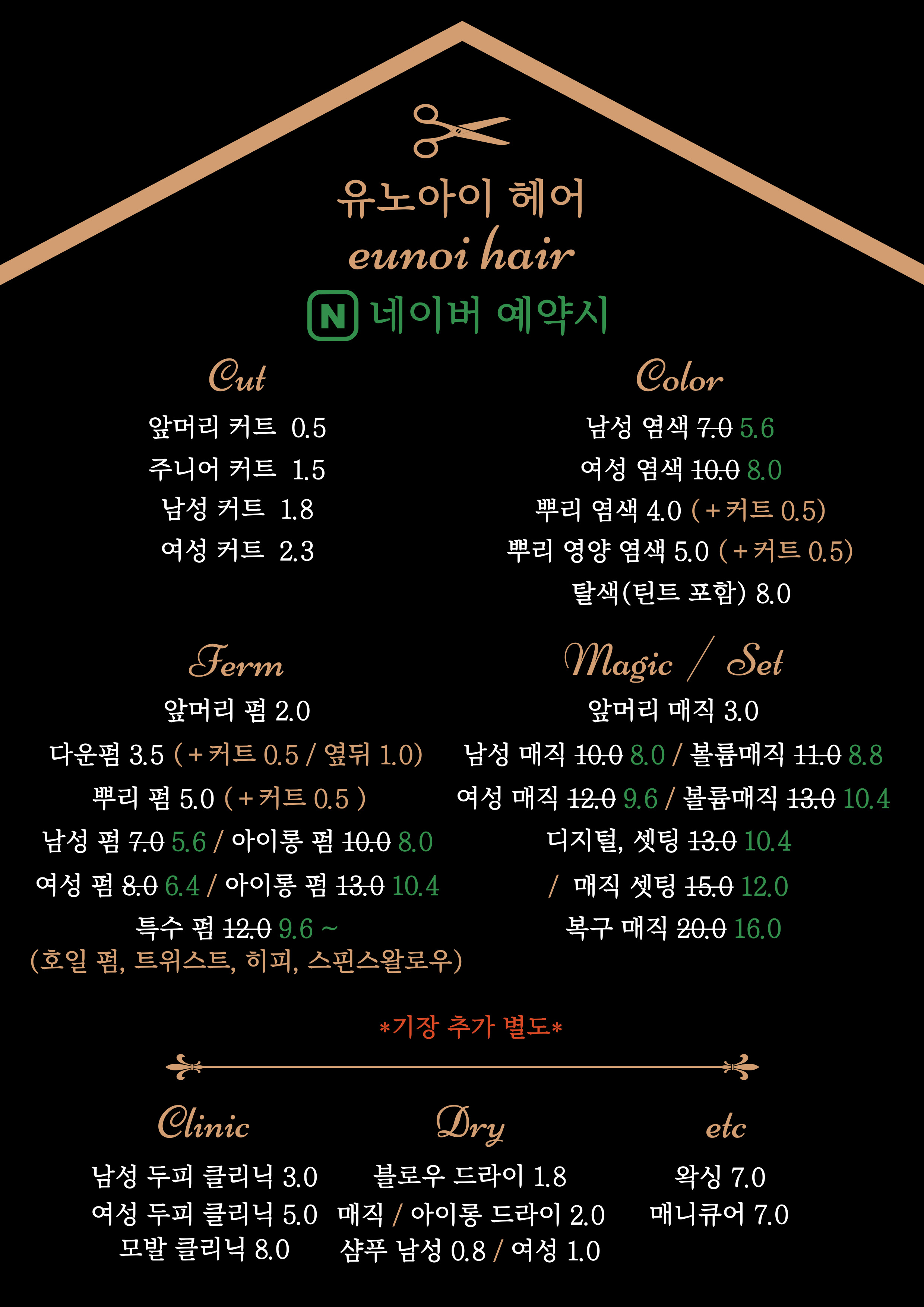| 소개글: 탈색/염색/아이롱 전문 헤어샵 유노아이 헤어 ( EUNOI HAIR ) 영업시간: 10:30~19:30 <~ 이벤트 진행 중 ~> [다운펌 + 커트 : 5만원 -> 4만원] [옆뒤 다운펌 + 커트 : 6만원 -> 5만원] [뿌리 염색 + 커트 : 5.5만원 -> 4.5만원] [뿌리 영양 염색 + 커트 : 6.5만원 -> 5.5만원] * 네이버 예약 후 리뷰 작성시 20% 할인 (단, 커트 및 부분 시술 제외) * 전화 예약과 네이버 예약이 동시에 들어오는 경우 또는 원활한 시술을 위해 고객님께 따로 전화로 안내 드립니다 ^0^ * 원하시는 스타일 사진이 있으시다면, 디자이너에게 보여주세요. 참고하여 스타일 해드리겠습니다 ^0^ * 정확한 가격은 디자이너와의 상담을 통해 결정됩니다. 불필요한 옵션이나 올려치기는 없으니 걱정하지 않으셔도 됩니다 ^0^ * 매장 상황에 따라 담당자가 변경될 수 있습니다. 특정 담당자의 스타일링이 필요하신 분은 요청사항에 적어주세요. 필요한 경우 가능한 시간대를 안내해드리겠습니다. * 차량 방문시 주차 가능합니다. 도착시 매장 전화 주시면 감사하겠습니다 ^0^ * 일정상 급히 해야하는 시술이 있다면 톡톡 또는 매장으로 연락해주세요.가능 여부를 확인해드리겠습니다 ^0^ * 이외의 궁금하신 사항은 매장으로 전화주시면 친절히 상담해드리겠습니다 ^0^ |