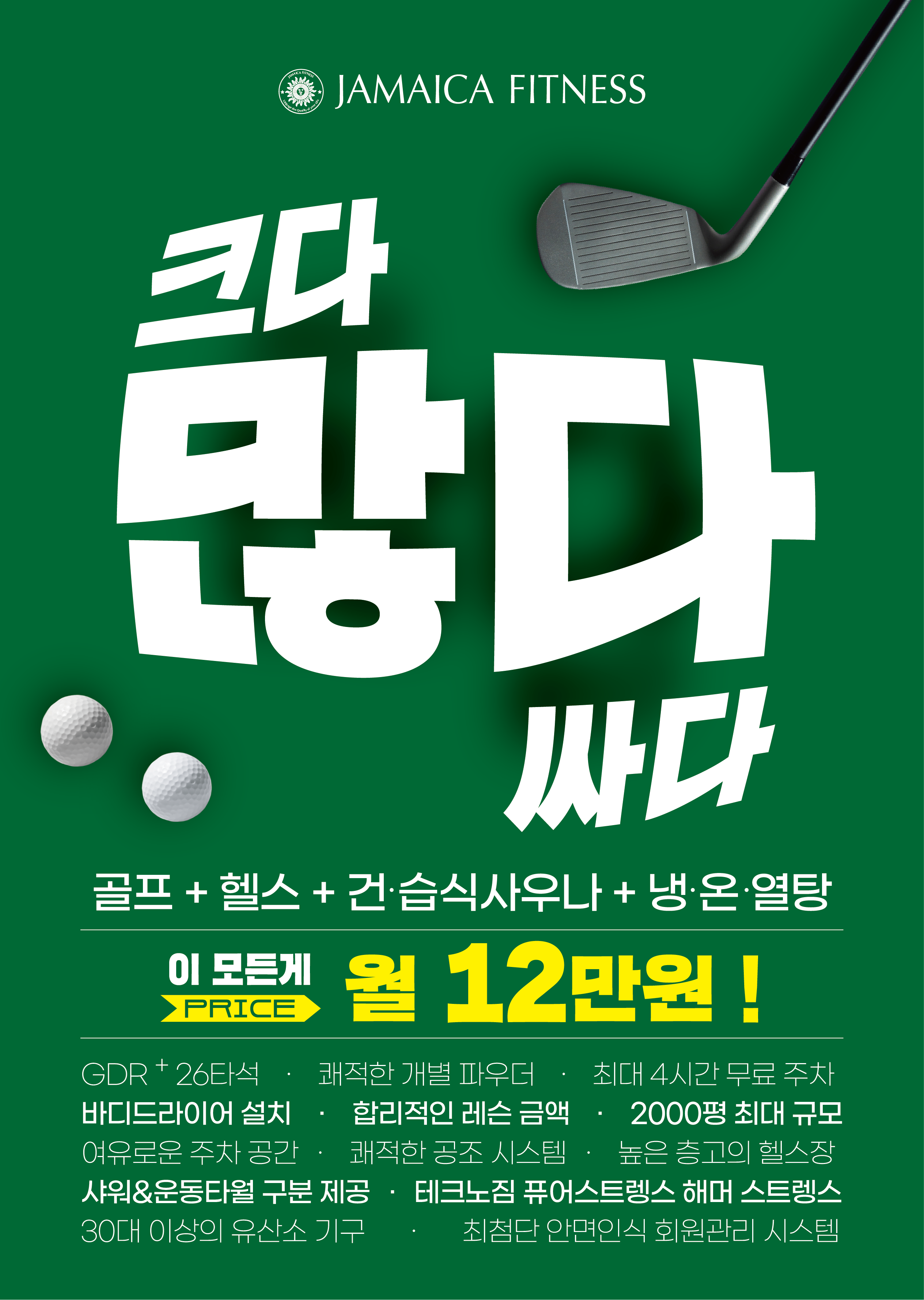 | 소개글: 안녕하세요! 자마이카 피트니스 강남뱅뱅점 입니다~ 저희는 강남에 위치한 최대규모 2,000평대 호텔식 스파형 토탈 휘트니스/GDR 골프 등 다양한 프로그램을 이용해보실 수 있으며, 최첨단 AI안면인식 시스템이 도입된 만능 센터로 입지가 단단합니다. 또한 센터 구간 별 공기 정화작업을 통해 회원분들께서 마음껏 운동에만 집중하실 수 있도록 큐어 클린 급배기 시스템을 구축해 두었습니다. 언제나 방문해주시는 회원 여러분들께 불편함이 없도록 노력할 것을 약속드립니다. 감사합니다~ -GDR+골프 전타석(26) -헬스/PT -사우나(건식, 습식) -찜질방(황토방, 산림욕방, 소금방) -목욕탕(열탕, 온탕, 냉탕) -카페테리아 -마사지/수면실/이발소 궁금한게 있으시면 언제든지 문의주세요! 언제든지 상담 도와드리겠습니다. |