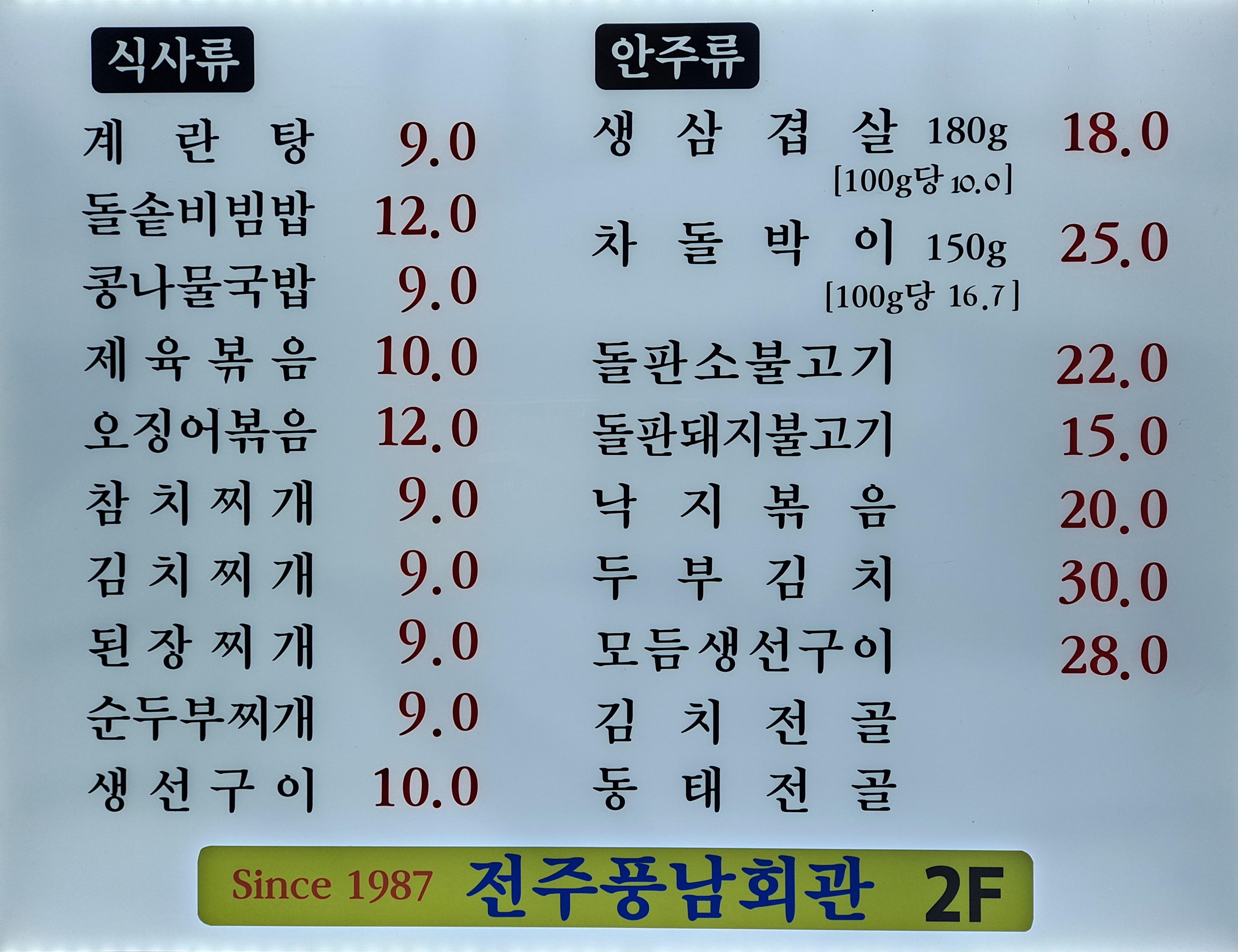 | 소개글: 57년 전통의 노포, 냉삼의 원조격이다. 파절이가 아닌, 달지 않은 파무침을 곁들여 먹는 냉삼이 대표메뉴. 93세의 할머니 사장님이 아직도 현역으로 계신다. 점심시간에는 주변의 직장인들로 항상 붐비기 때문에 여유로운 식사를 즐기기 위해서는 바쁜 시간은 피하는게 좋다. 철판에서 볶은 제육볶음 맛이 일품인 제육철판이 점심 대표메뉴이다. |